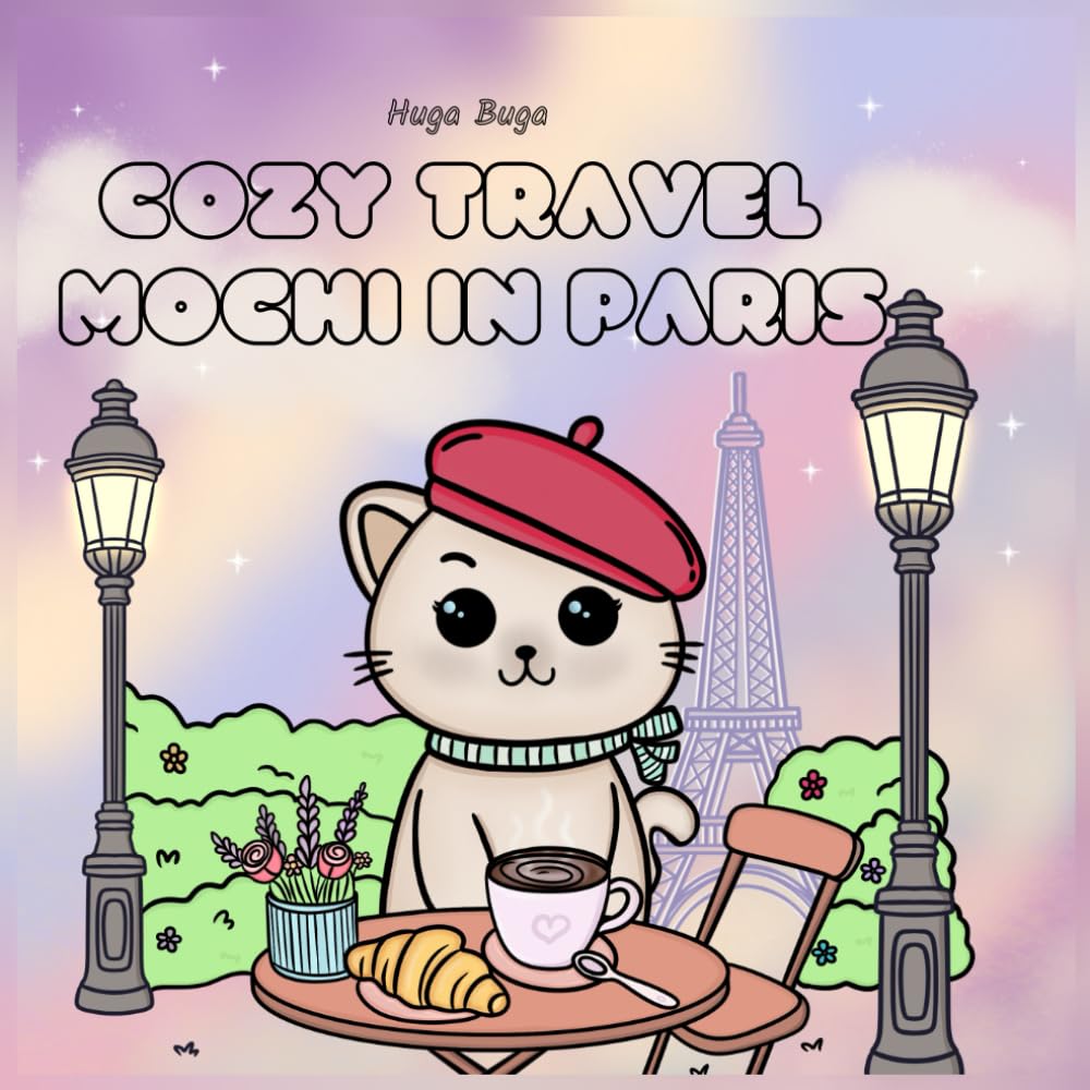 **Cozy Travel - Mochi In Paris er en håndtegnet Malebog | 40 Sider Huga Buga Stil | Design til Afslapning og Sjov