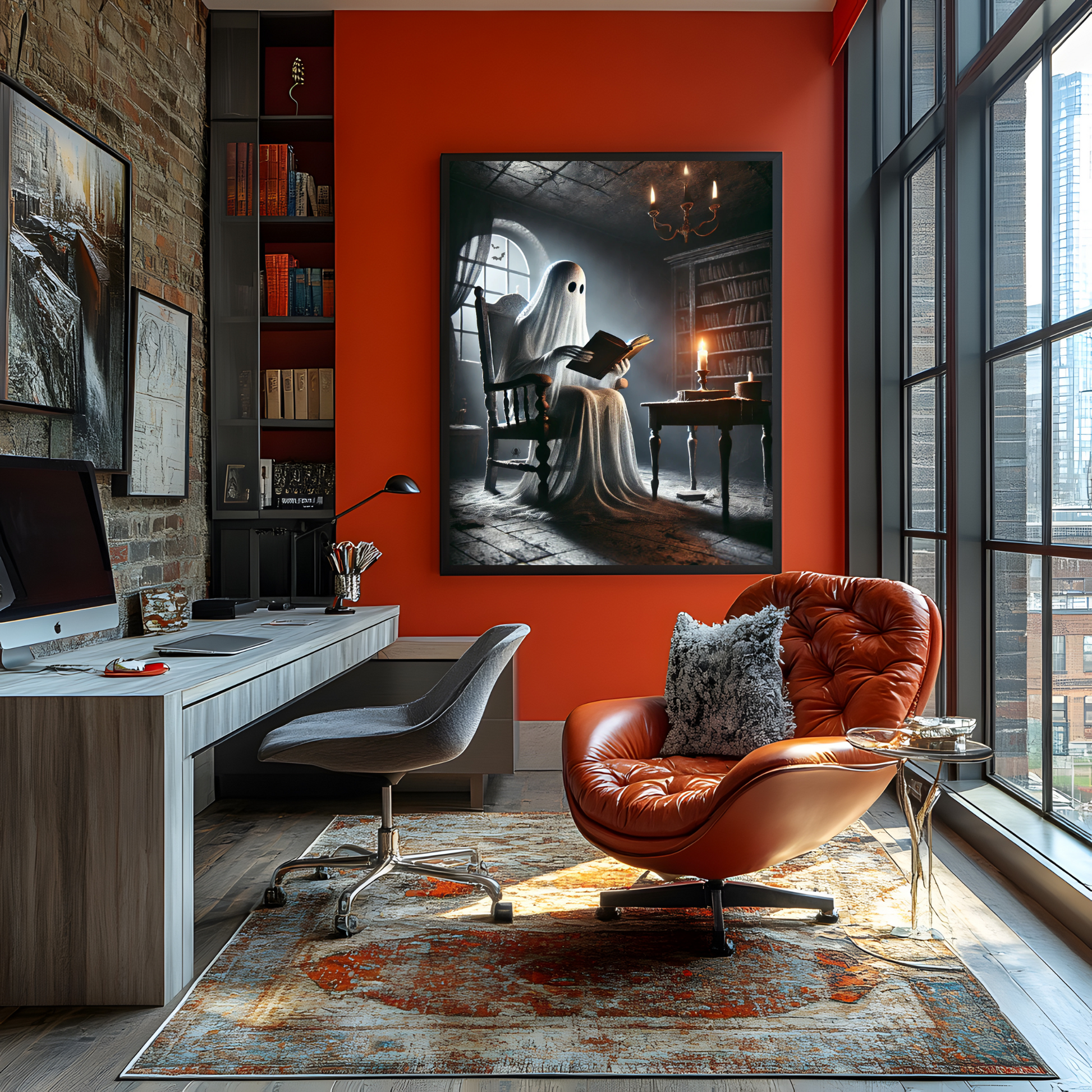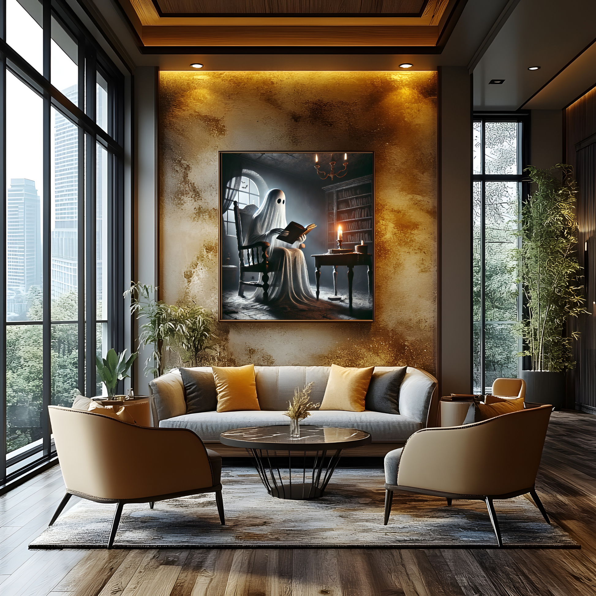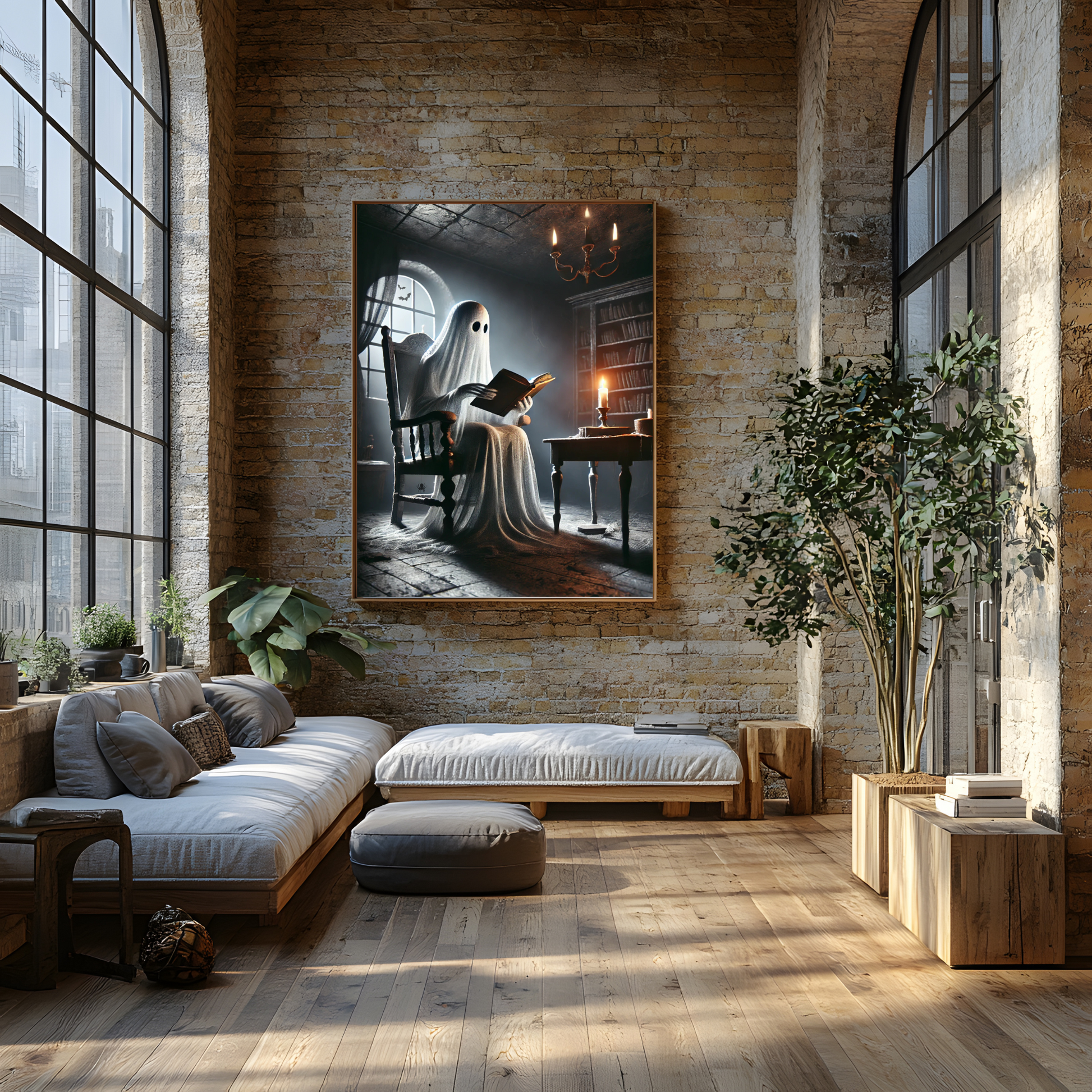 Bring et strejf af charmerende, spøgelse der læser en bog til dit hjem med denne unikke digitale kunstplakat, der viser et spøgelse der læser en bog! Dette fængslende maleri fremkalder en nostalgisk, lidt uhyggelig, men alligevel elskelig scene, perfekt til at tilføre karakter til din sæsonbestemte eller helårsindretning. De rige teksturer og den stemningsfulde baggrund skaber en vidunderligt dyster atmosfære.