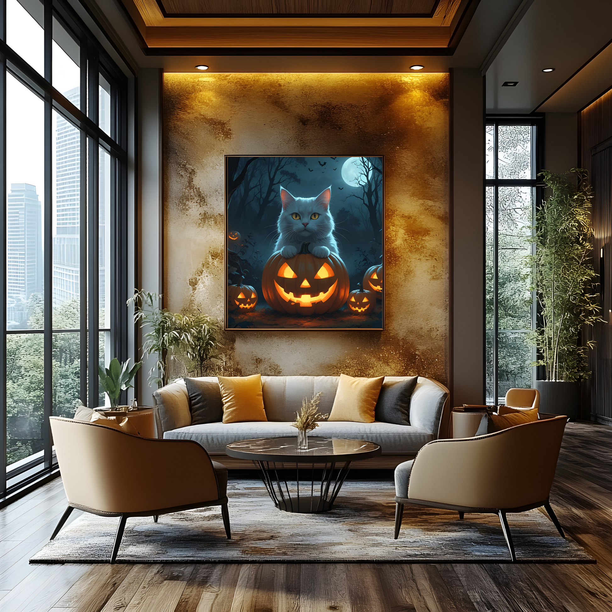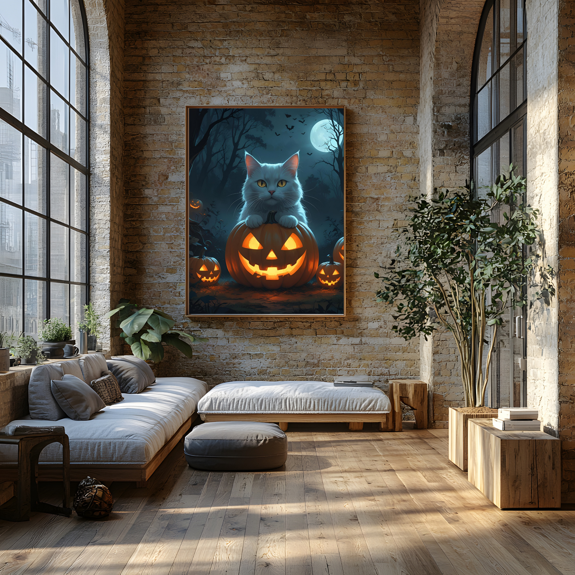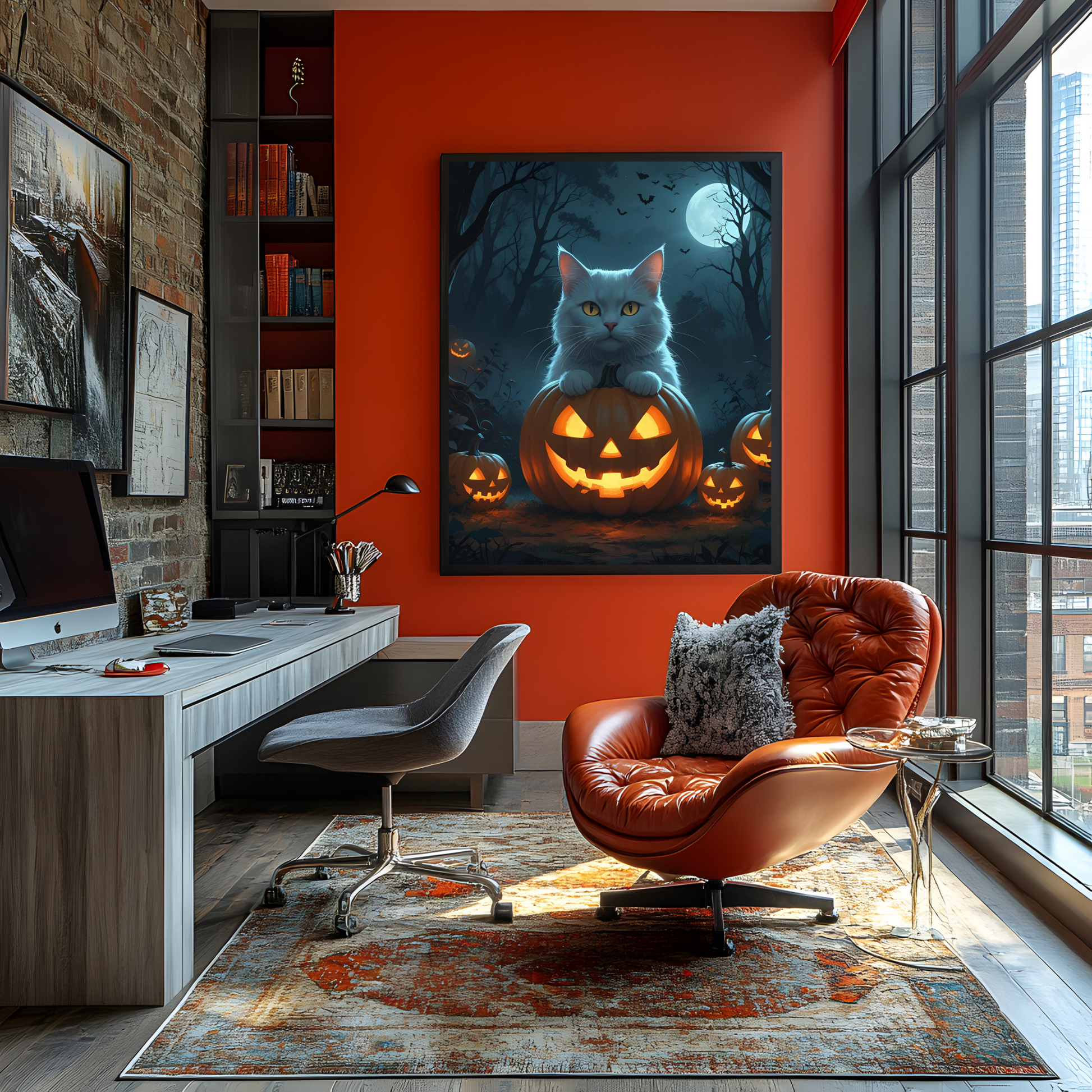 Bring et strejf af charme, kat med et græskar til dit hjem med dette unikke digitale kunsttryk, der viser en kat med et græskar! Dette fængslende maleri vækker en nostalgisk, lidt uhyggelig, men alligevel elskværdig scene, perfekt til at tilføje karakter til din sæsonbestemte eller helårsindretning. De rige teksturer og den atmosfæriske baggrund skaber en vidunderligt stemningsfuld atmosfære.