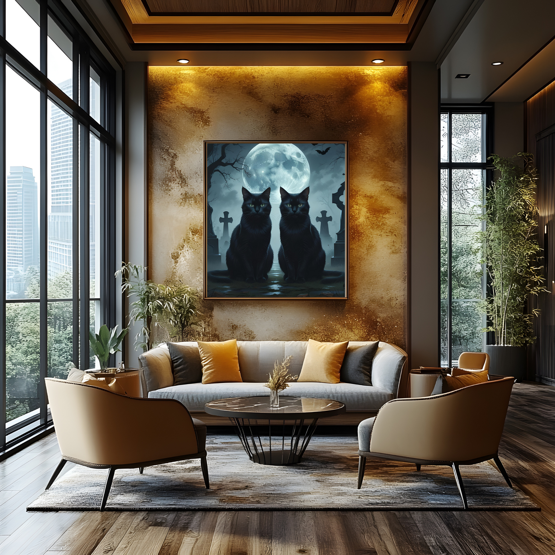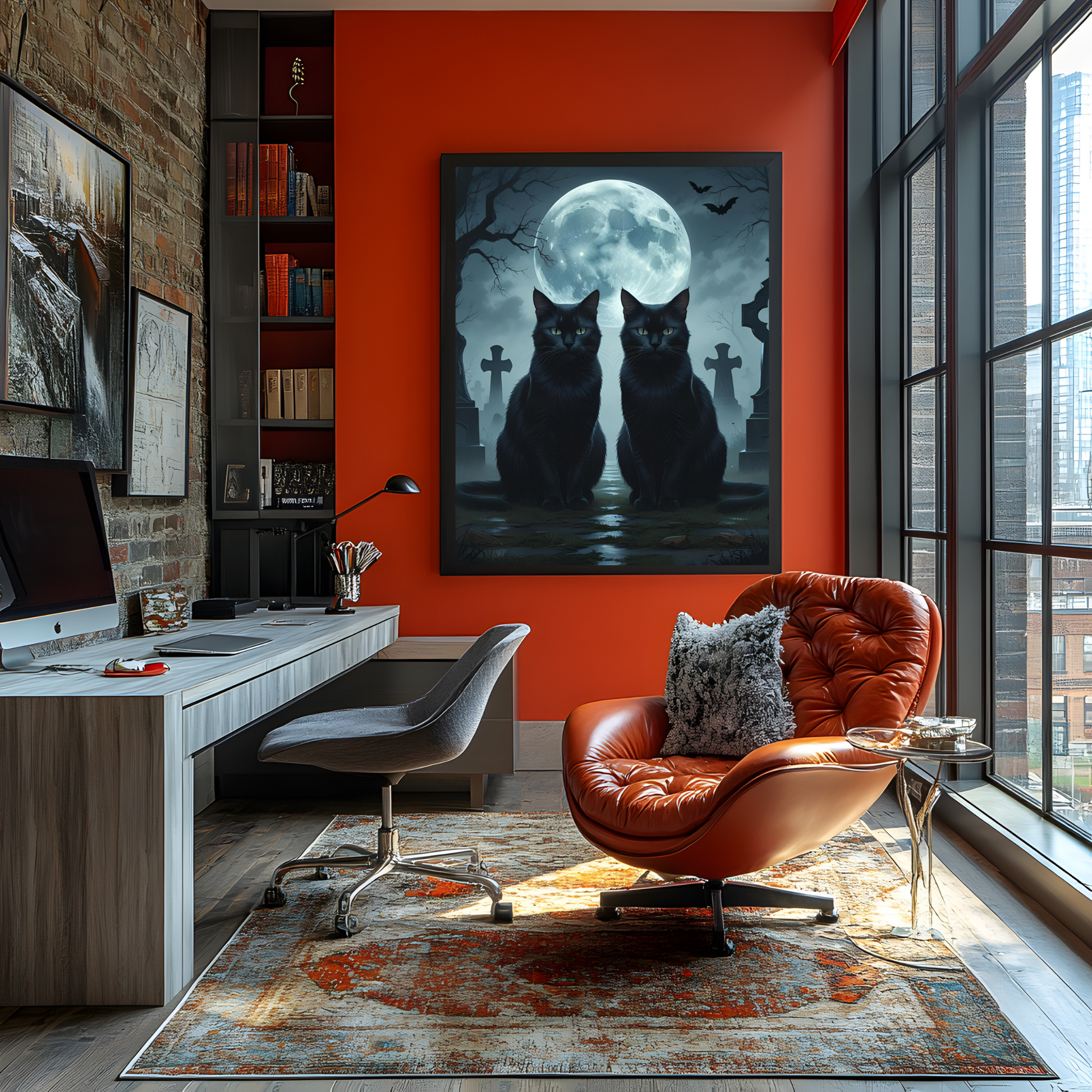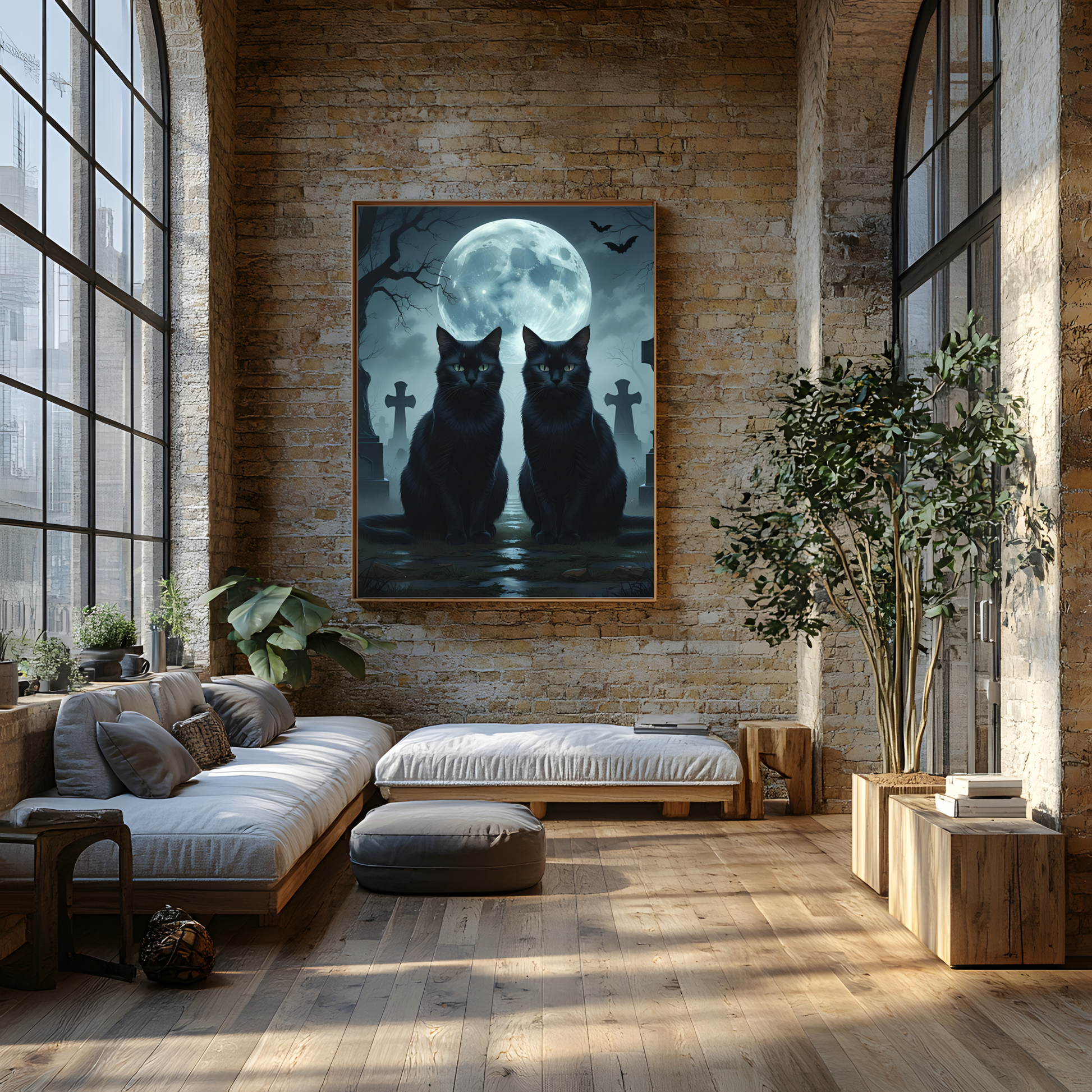 Bring et strejf af charmerende Halloween-katte ind i dit hjem med denne unikke digitale kunsttryk, der viser 2 søde Halloween-katte! Dette fængslende maleri vækker en nostalgisk, let uhyggelig, men alligevel kær scene, perfekt til at tilføre karakter til din sæsonbestemte eller helårsdekoration. De rige teksturer og den stemningsfulde baggrund skaber en vidunderligt stemningsfuld atmosfære.