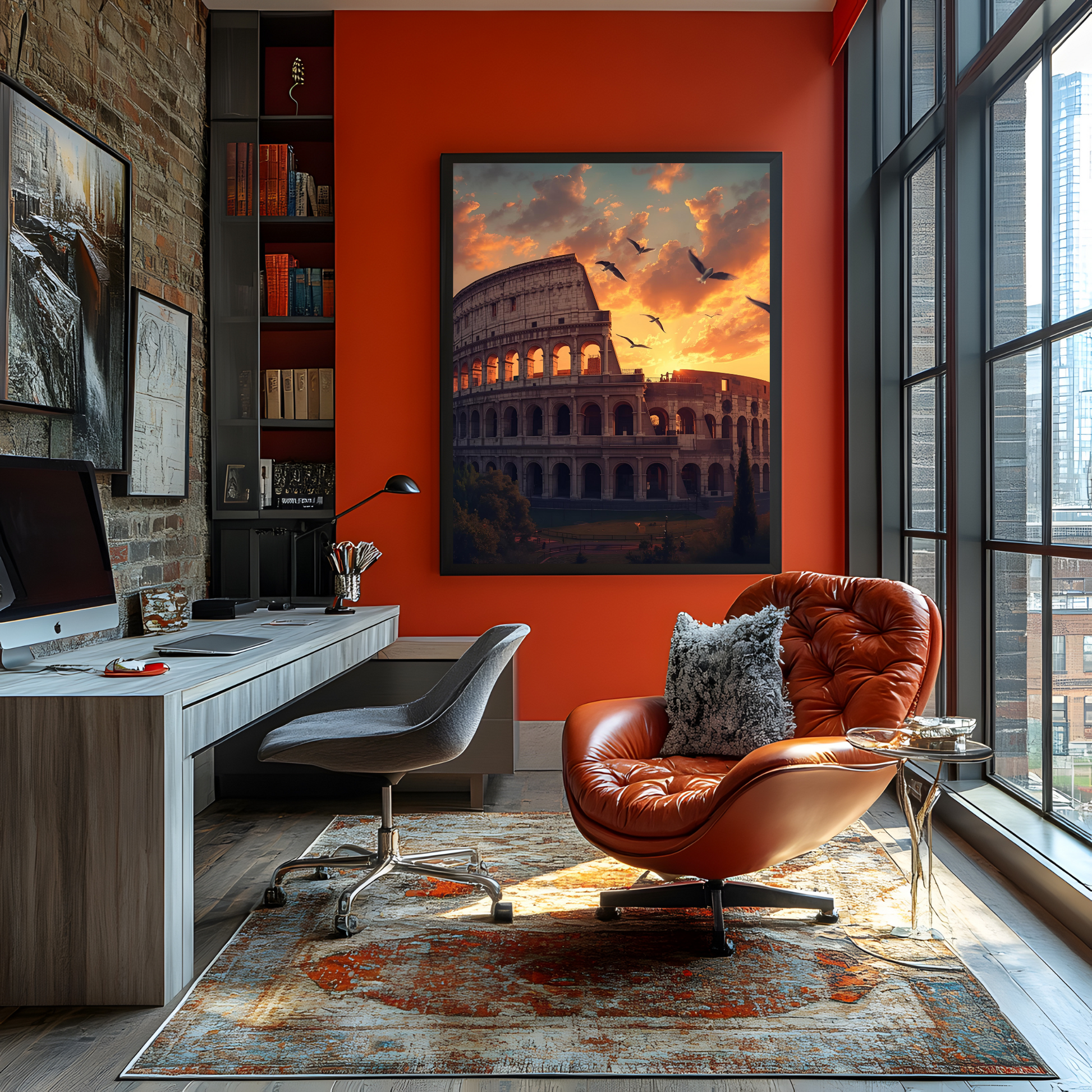 Bring et strejf af charmerende, gammeldags til dit hjem med dette unikke digitale kunsttryk Colosseum i Rom! Dette fængslende maleri fremkalder en nostalgisk, lidt uhyggelig men alligevel elskelig scene, perfekt til at tilføje karakter til din sæsonbestemte eller året rundt indretning. De rige teksturer og stemningsfulde baggrunde skaber en vidunderligt dyster atmosfære.
