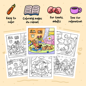 En malebog fyldt med nuttede, sjove og hygge momenter med hunde 🎀 Hver side indbyder til at du bringer siderne til live med en masse farver 🩷