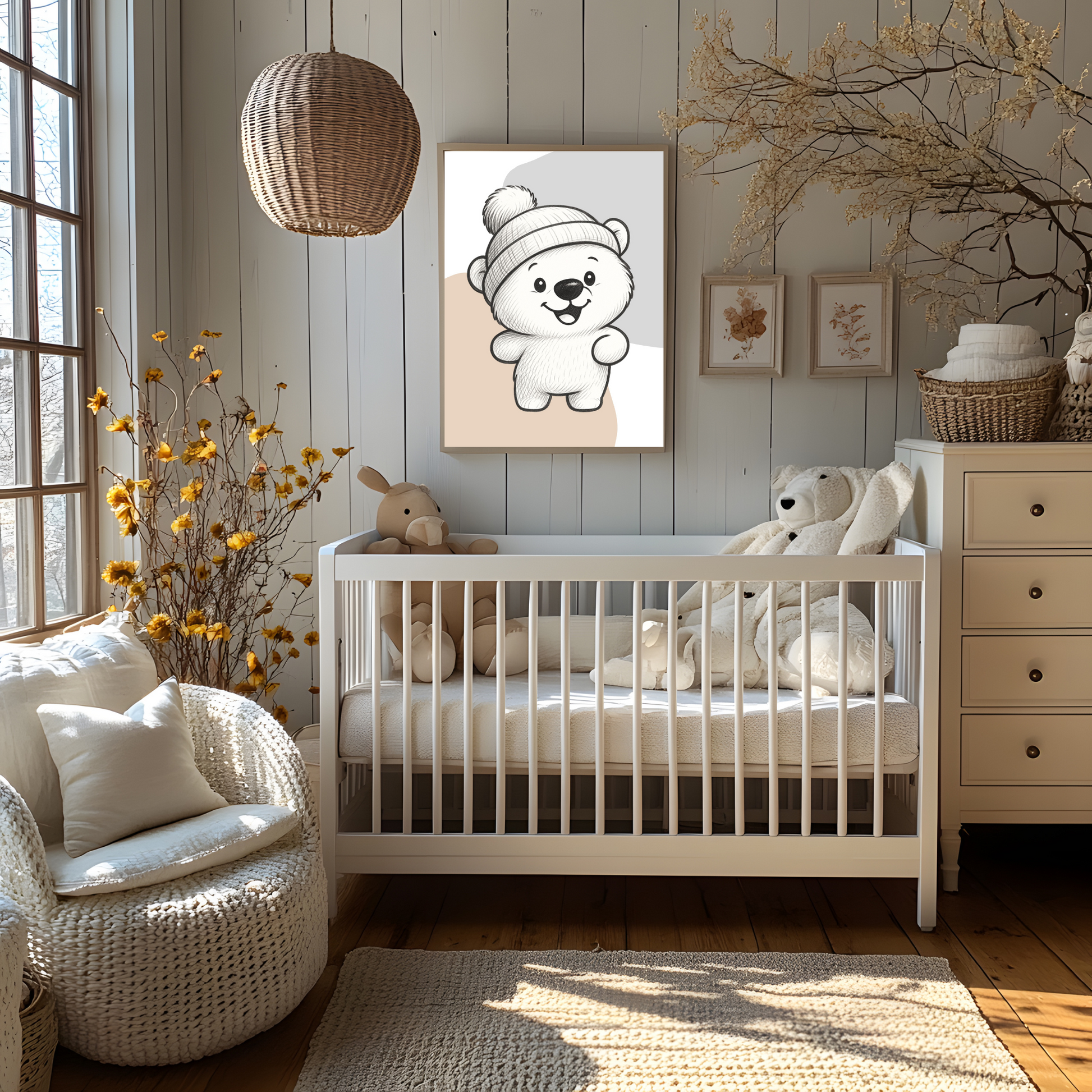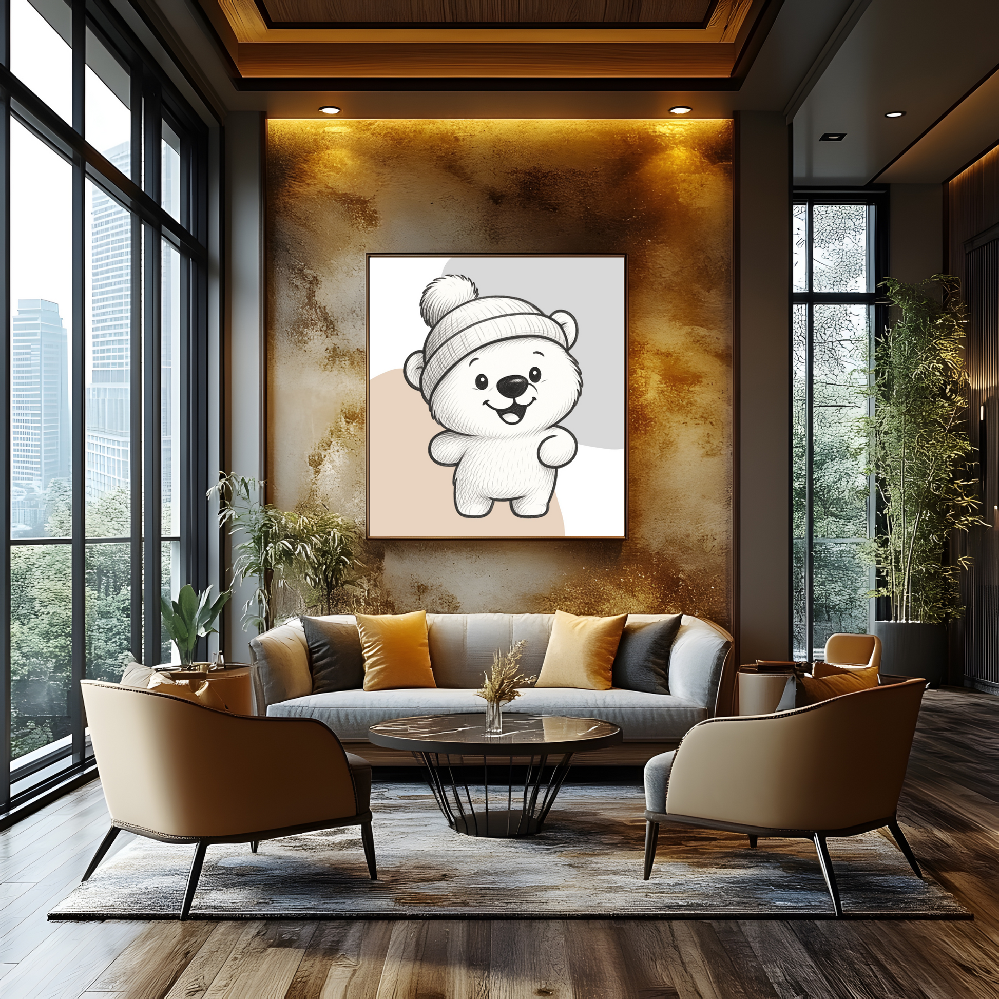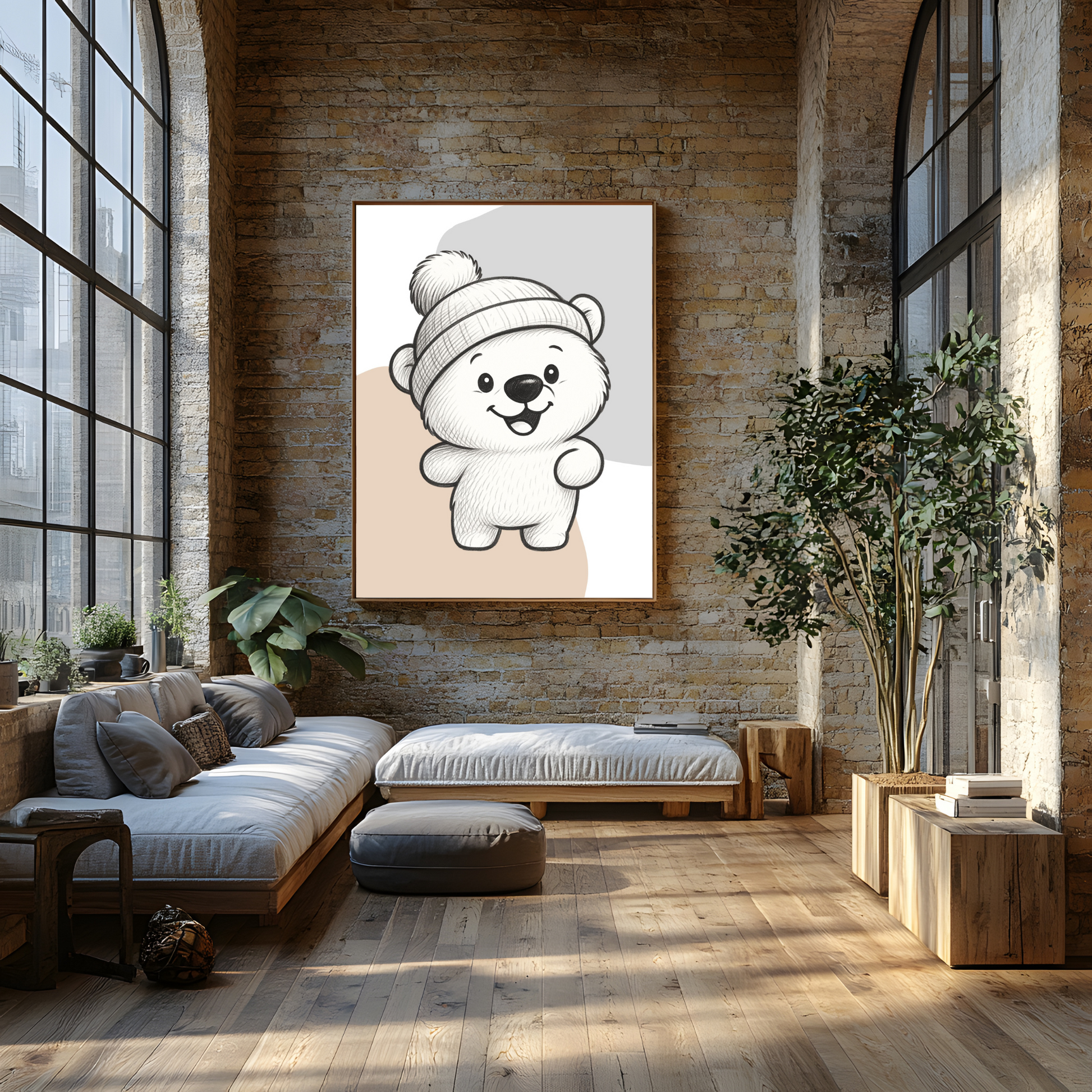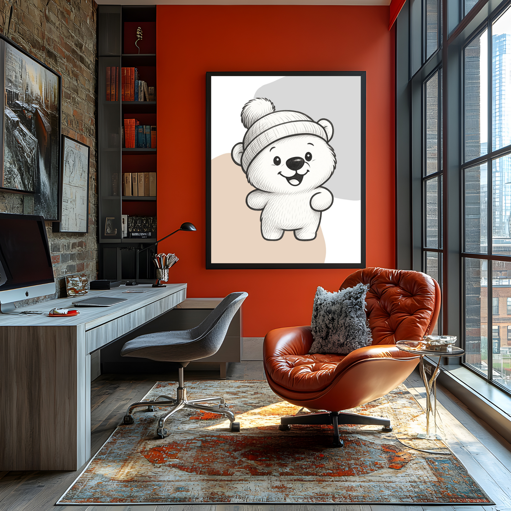 Dette billede er ikke bare et billede; det er en følelse, en påmindelse om glæden og uskylden i livet. Hver gang du ser på det, vil du blive transporteret tilbage til en tid, hvor verden var fuld af eventyr og muligheder. Så lad denne bamse med sin sjove hue og sit glade "Huga Buga" blive en del af dit hjem og dit hjerte.